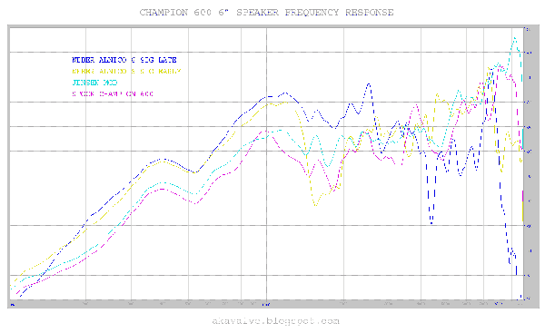 Il mio principale riferimento per le modifiche sul Champion 600, akavalve, ha fatto una piccola analisi in questa direzione, testando tre diversi coni a confronto con quello stock (http://akavalve.blogspot.it/2009/10/cahmpion-600-speaker-upgrade-comparison.html). Oltre a confrontarne le differenze al suo orecchio, ha voluto valutarne la risposta in frequenza (analisi che poi ha giustificato alcune delle impressioni che si era fatto). Ovviamente, le tabelle sotto riportate sono opera sua.